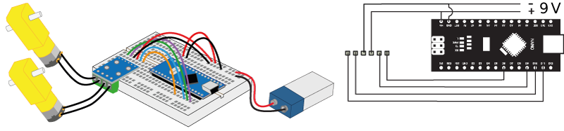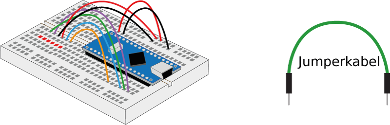 Mit diesem Wissen kann nachvollzogen werden, dass sowohl beim Nano als auch beim Motorentreiber alle Kontakte elektrisch voneinander getrennt sind. Für die gewünschten Funktionen müssen sie über Leitungsdrähte miteinander verbunden werden.
