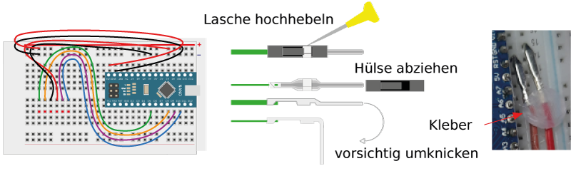 Um das zu realisieren, müssen die Isolierhülsen entfernt und die Enden – wie unten gezeigt – umgeknickt werden. Mit etwas Heißkleber o. ä. kann sichergestellt werden, dass sich die blanken Teile auf dem Breadboard nicht berühren.
