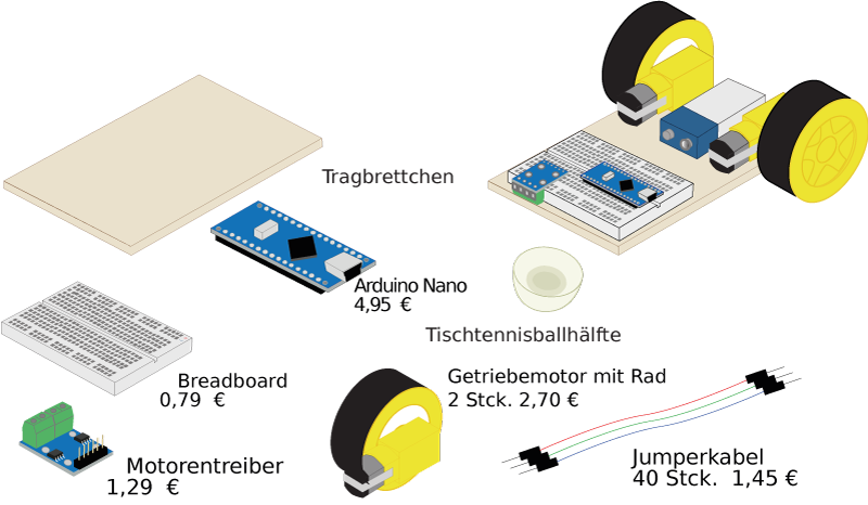 Für ein programmierbares Fahrzeug werden die unten gezeigten Teile benötigt mit Gesamtkosten von etwa 15 €. Mit Heißkleber können sie leicht auf dem Tragbrettchen befestigt werden.
