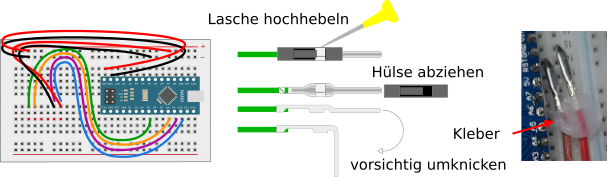 Um das zu realisieren, müssen die Isolierhülsen entfernt und die Enden – wie unten gezeigt – umgeknickt werden. Mit etwas Heißkleber o. ä. kann sichergestellt werden, dass sich die blanken Teile auf dem Breadboard nicht berühren.