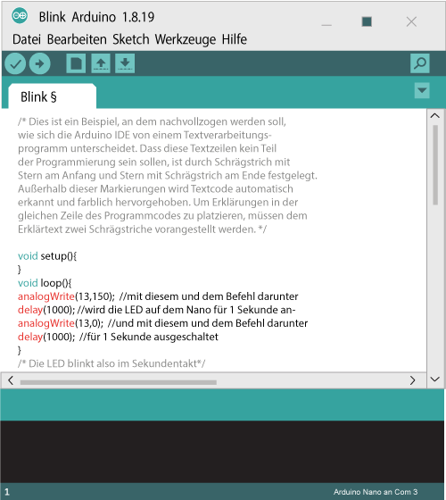 Um das den Schüler*innen zu vermitteln, sollte ihnen der oben links angezeigten Text beispielsweise in einem Textverarbeitungsprogramm vorgehalten werden. Aufgabe soll sein, ihn durch „Copy & Paste“ in die Arduino IDE einzufügen. Dabei sind sowohl das Kopierverfahren bedeutsam als auch der Umstand, dass die IDE den Text analysiert und unter anderem darin enthaltenen Code farbig hervorhebt.