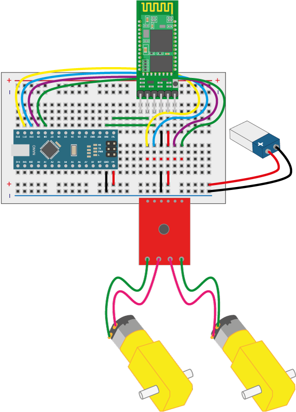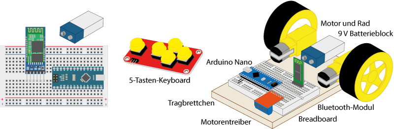 HC-05 — Motortreiber — Breadboard — Motor mit Rad —Jumperkabel — Nano — 5-Tasten-Keyboard