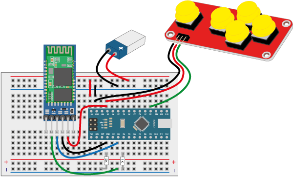 In der Zeichnung unten ist das HC-05 Modul über einen Spannungsteiler und über die Pins 3 und 4 realisiert. Sowohl das HC-05 als auch das 5-Tasten Keybord beziehen ihren Strom von 5V Pin des Nano. GND kann direkt von der Batterie oder einem beliebigen GND Pin am Nano abgegriffen werden.