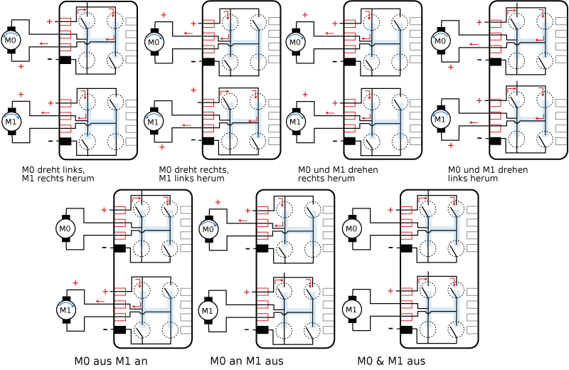 In dieser Zusammenstellung können zwei Motoren vollumfänglich gesteuert werden. Das heißt, sie können gestartet und gestoppt werden sowie vor- und rückwärts laufen.