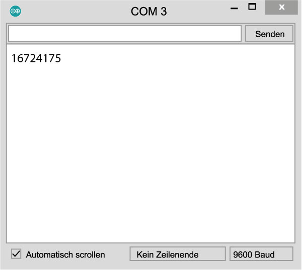 Wird die Fernbedienung auf den IR-Empfänger gerichtet und eine Taste gedrückt, zeigt sich im Fenster des seriellen Monitors eine Zahlenfolge.