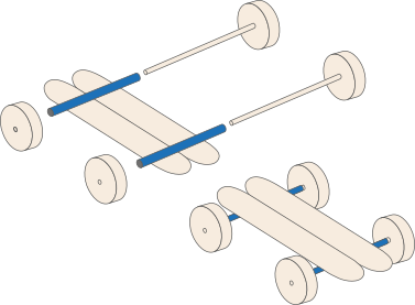 Zur Konstruktion des Fahrzeugs werden zwei Spatel der Länge nach zusammen- und zwei gleichlange Abschnitte eines Trinkhalms quer dazu geklebt. Danach werden in die Bohrungen der Räder Schaschlikspieße gesteckt, diese durch die Trinkhalme geführt und so eingekürzt, dass das gegenüberliegende Rad Halt findet, ohne die freie Drehbarkeit zu behindern. Wenn nötig, die Räder zusätzlich mit etwas Heißkleber sichern.